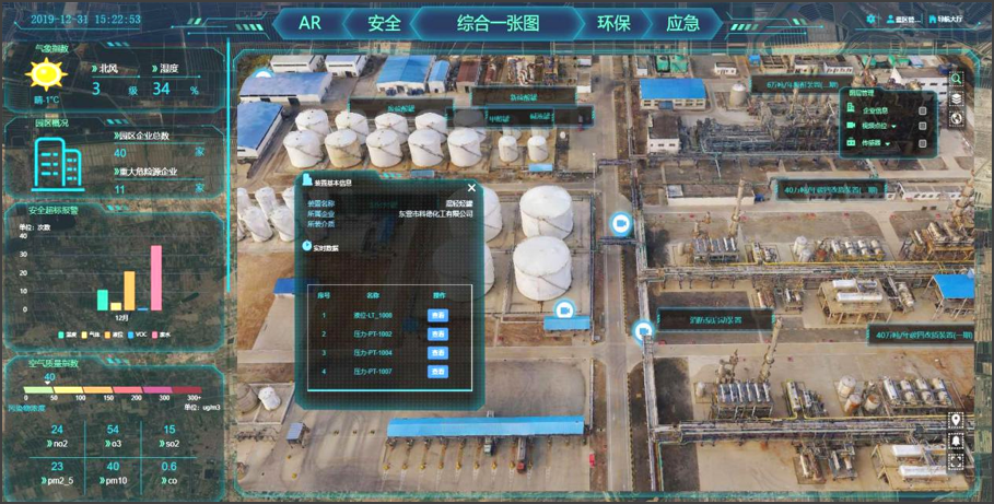 系統借助園區AR視頻監控終端、物聯網平臺、人工智能算法及大數據增值工具,為園區領導提供安監、環保、經濟、能源等核心業務的監管決策,為園區企業提供“無感化”管理服務。