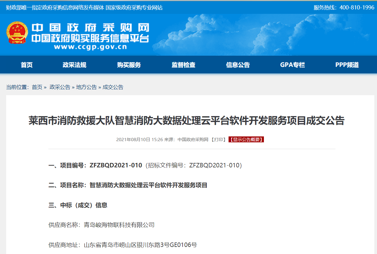 日前,峻海物聯(lián)再次中標(biāo),成功斬獲“萊西市消防救援大隊智慧消防大數(shù)據(jù)處理云平臺軟件開發(fā)服務(wù)”項目,為公司業(yè)務(wù)的可持續(xù)發(fā)展再添新彩。