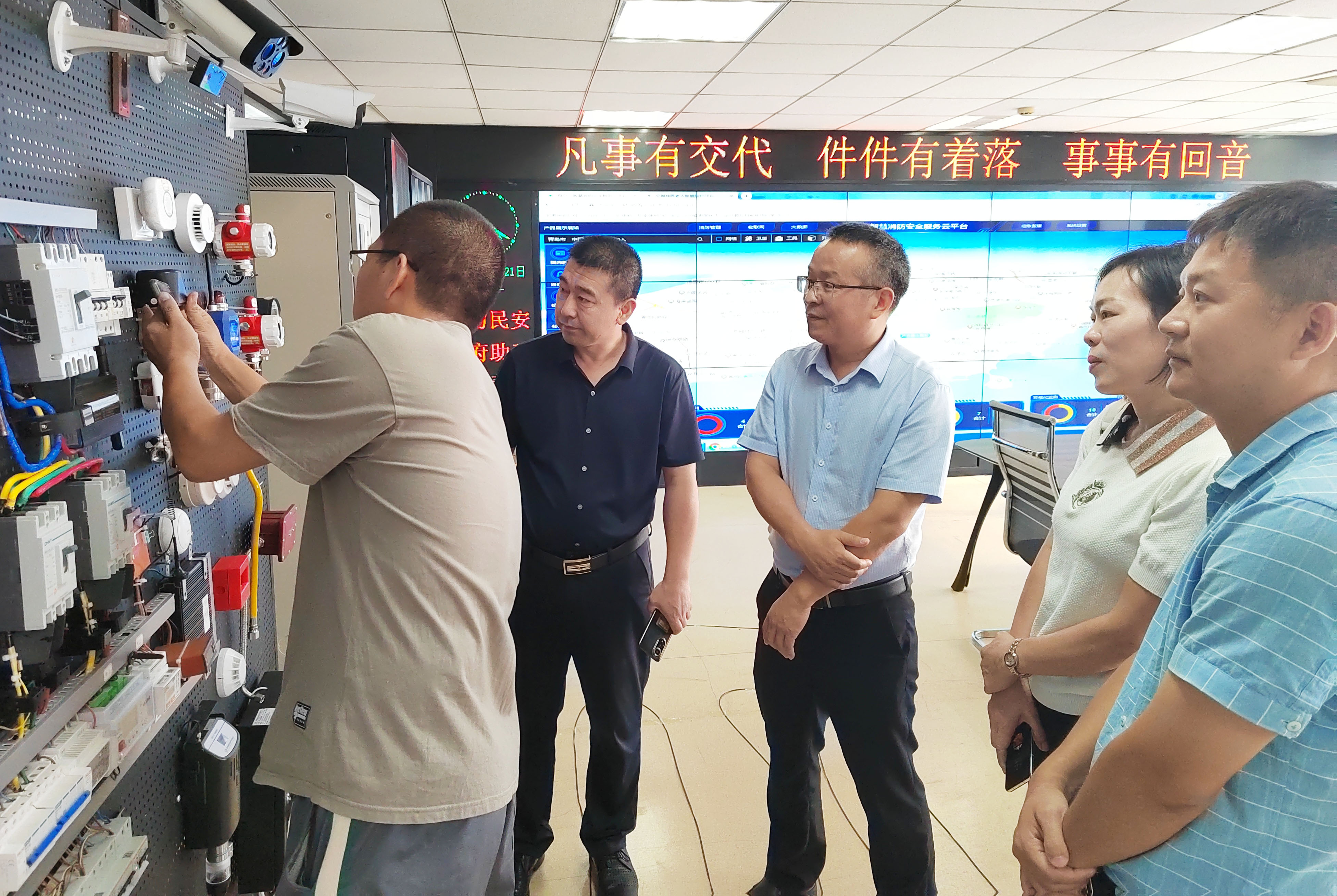 ▲ 運(yùn)營(yíng)人員為李鳳舉副局長(zhǎng)等領(lǐng)導(dǎo)講解物聯(lián)網(wǎng)設(shè)備的應(yīng)用功能