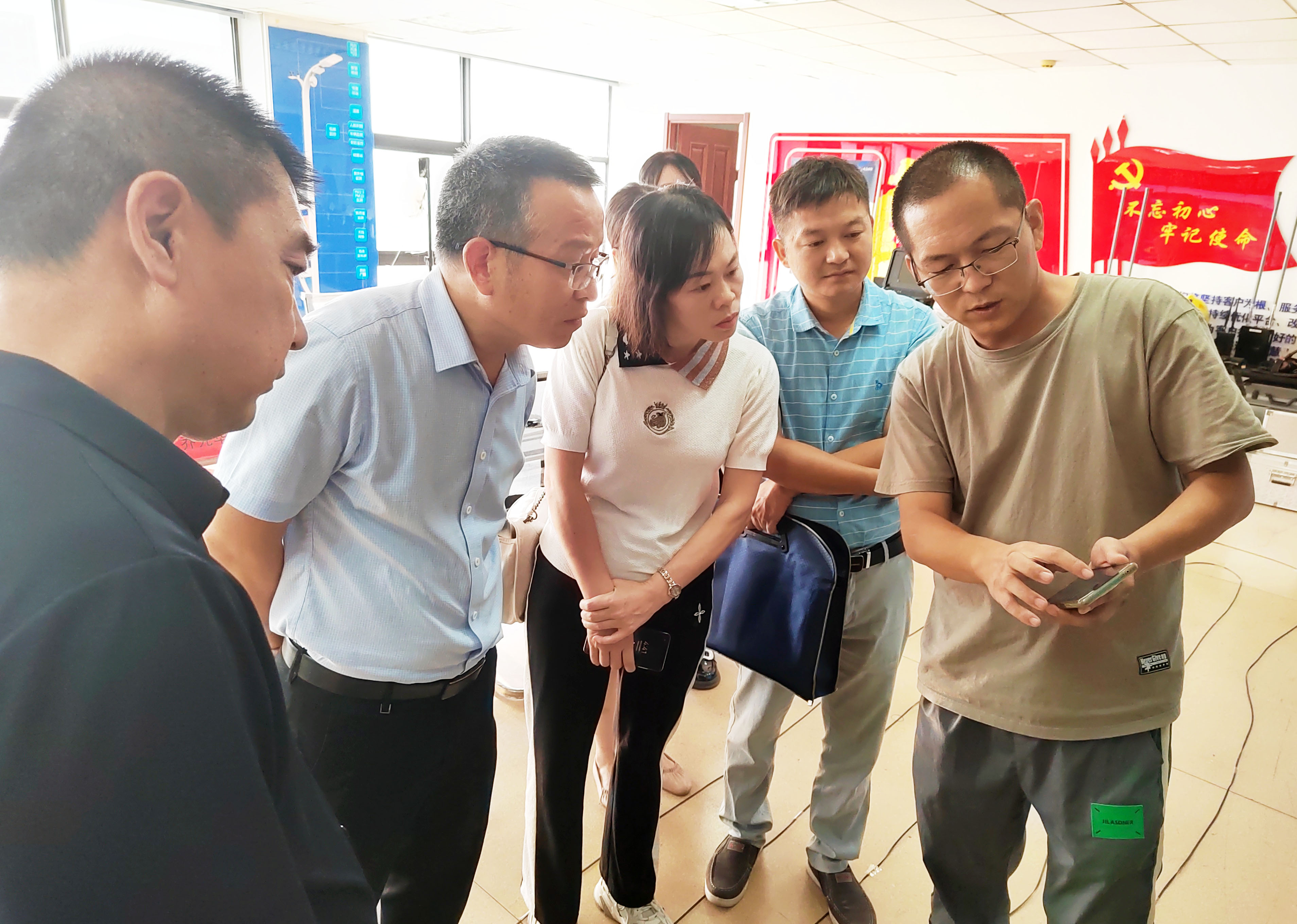 ▲ 運(yùn)營(yíng)人員為李鳳舉副局長(zhǎng)等領(lǐng)導(dǎo)講解手機(jī)APP隱患排查應(yīng)用功能