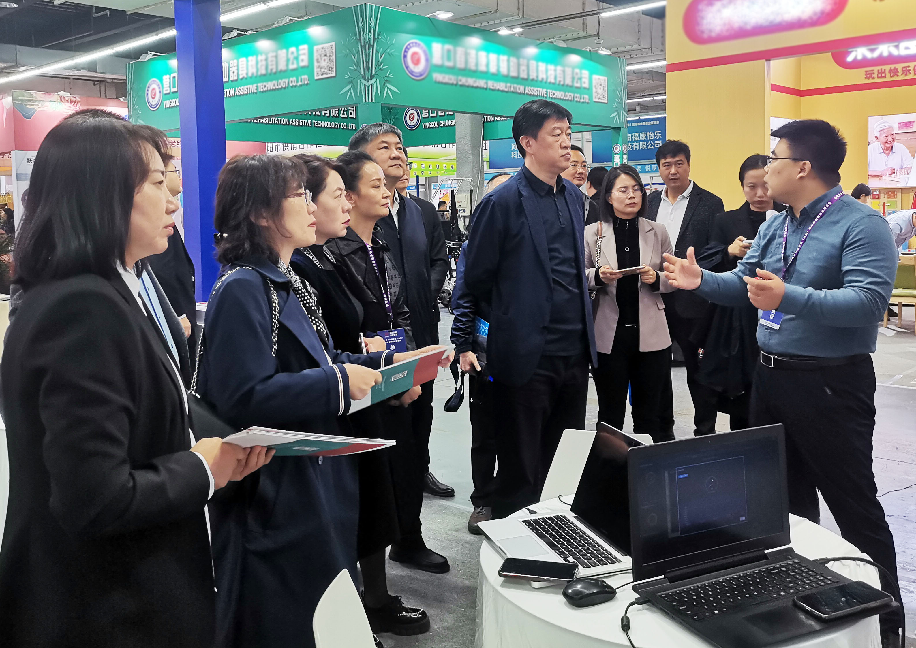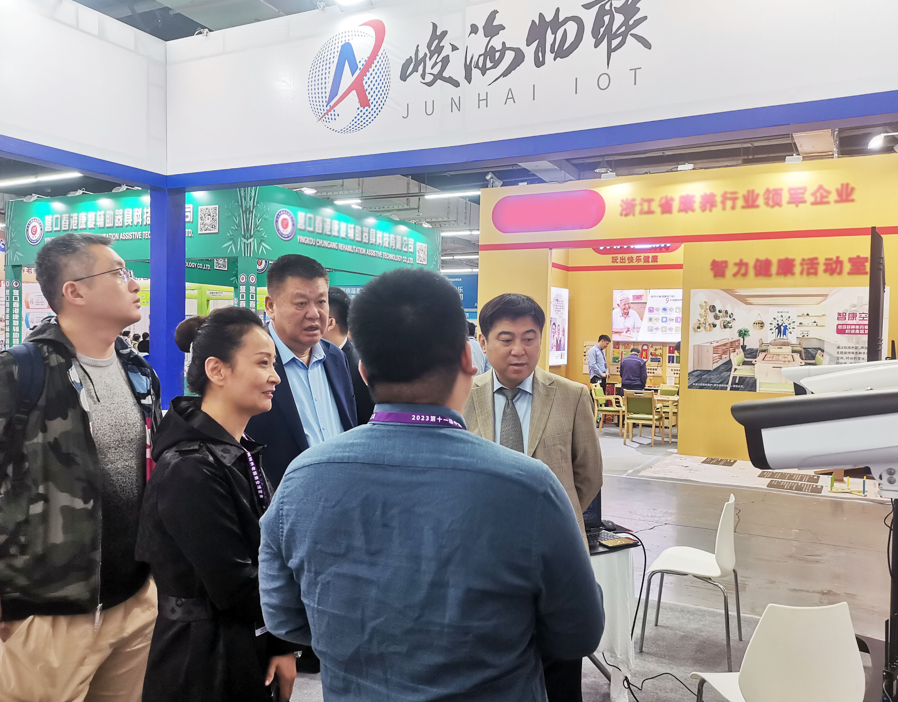 在相關人員的陪同下,青島市養老協會會長楊乃發等領導前來峻海物聯展位進行現場會觀摩,與峻海物聯的工作人員深入探討智慧產業康養化的未來發展前景。