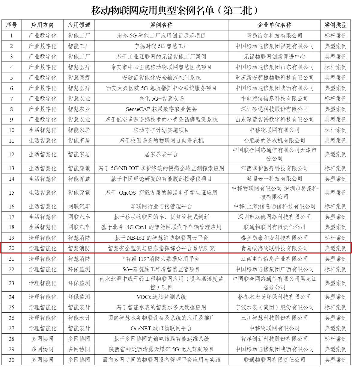 2023年11月30日,國家工業和信息化部在其官方網站對2023年《移動物聯網應用典型案例名單(第二批)》進行公示,經地方推薦、案例入庫、考察實施和專家評審等環節,從100個入庫案例中遴選出10個標桿案例和20個典型案例,共計30個移動物聯網應用案例。其中,峻海物聯在智慧消防領域的“智慧安全監測與應急指揮綜合平臺系統研究”成功入選典型案例。