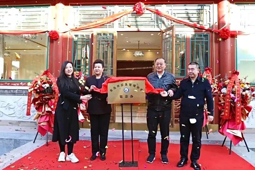 儀式現場,中國應急管理學會應急產業工作委員會副主任委員兼秘書長、青島市應急管理協會會長張旭明(左二),青島市應急管理協會常務副會長張國勝(右二),青島市應急管理協會輪值會長林智艷(左一),青島市應急管理協會副會長孫素朋(右一)共同為青島市應急管理協會駐京辦事處揭牌。