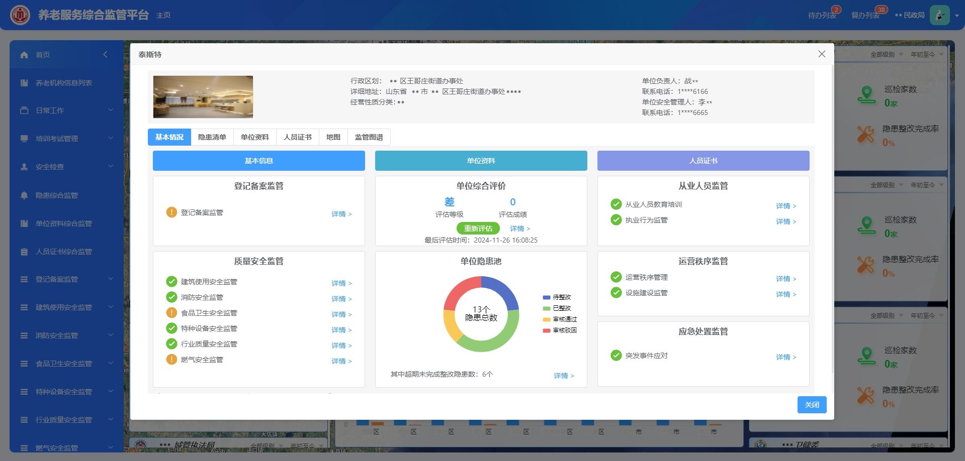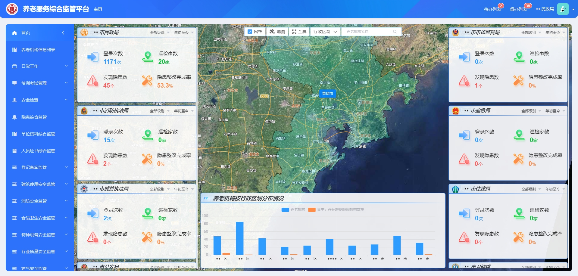 一是凝聚部門合力,實現高效協同。平臺著眼整體整治、上下貫通、條抓塊統、系統集成和高效協同的目標,以民政局為主體,聯動行政審批局、衛(wèi)健委、公安局、住建局、消防救援局、市場監(jiān)管局、醫(yī)保局、人社局、教育局、司法局、自然資源和規(guī)劃局、應急局和城管執(zhí)法局形成13個部門合力,可實現快速推進養(yǎng)老服務工作的落實。