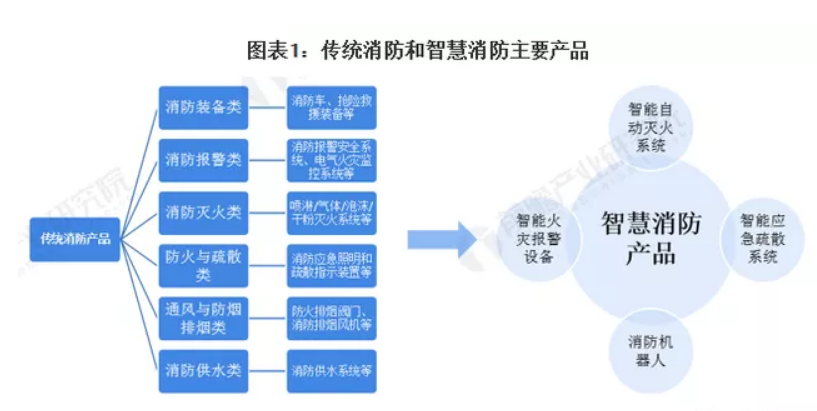智慧消防概念包含借助物聯網、互聯網+、云計算等新一代信息技術,立足于消防的職能需求,建設智慧消防平臺,連接各傳統消防產品,因此智慧消防產品主要包含自動滅火系統、火災報警設備、智能應急疏散系統、消防機器人等。