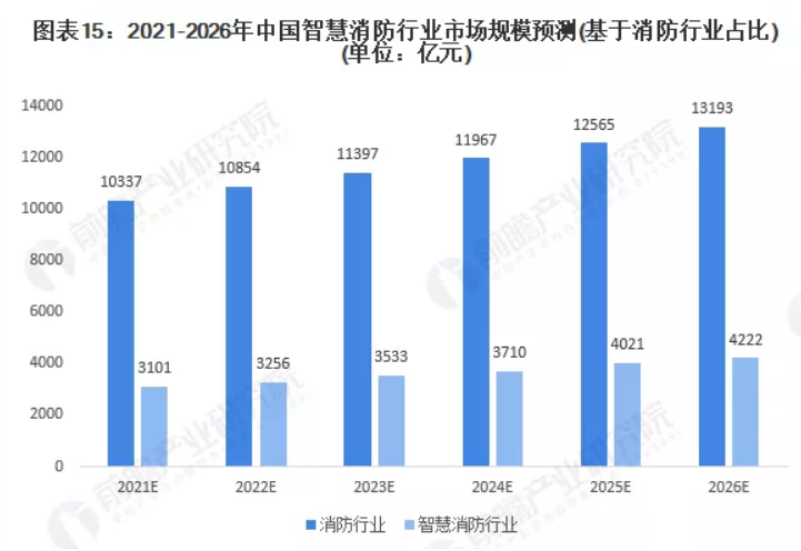結合我國消防行業投資規模現狀,前瞻以5%的增速保守測算2026年中國消防行業市場規模有望達到13193億元,2021-2026年,中國智慧消防滲透率有望達到30%以上。據此,前瞻估算2026年中國智慧消防市場規模有望達到4222億元,建設智慧消防系統前景看好。