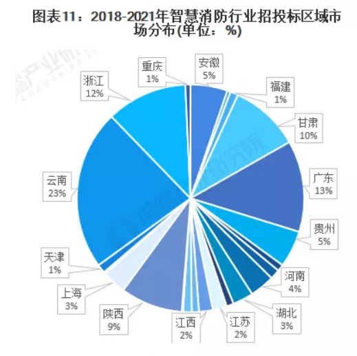 從我國智慧消防招投標項目區域競爭格局來看,市場整體較為分散,其中,2018-2021年云南地區智慧消防項目中標金額占比達23%,排名第一;其次為廣東省,占比達13%;浙江地區排名第三,智慧消防項目中標金額占比達12%。