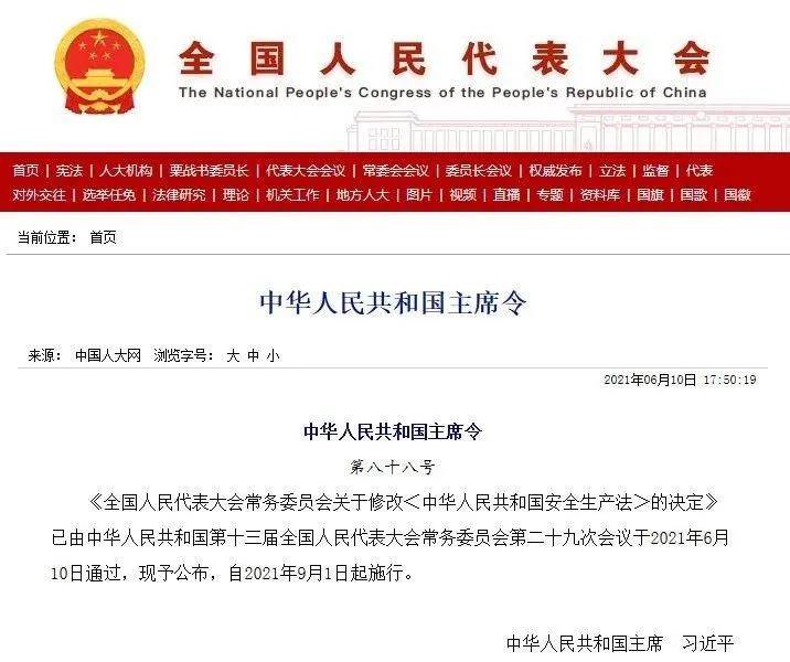 《全國(guó)人民代表大會(huì)常務(wù)委員會(huì)關(guān)于修改<中華人民共和國(guó)安全生產(chǎn)法>的決定》已由中華人民共和國(guó)第十三屆全國(guó)人民代表大會(huì)常務(wù)委員會(huì)第二十九次會(huì)議于2021年6月10日通過(guò),現(xiàn)予公布,自2021年9月1日起施行。