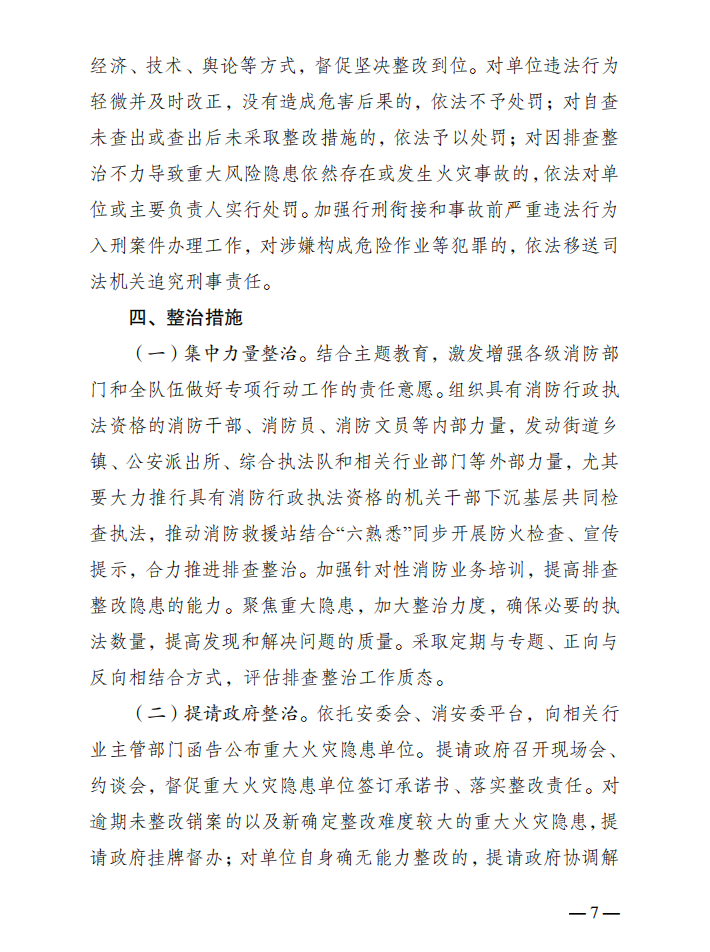《方案》要求,各地要強化組織領導,把專項行動作為主題教育檢視整改的重要內容,認真抓好落實。要強化統籌推進,以重點突破帶動整體提升,推動破解深層次突出問題,加快推動消防安全治理模式向事前預防轉變。要強化考核督導,將專項行動納入省級政府消防工作考核內容。要強化制度建設,堅持邊整治、邊總結,在推進消防安全重大風險隱患排查整治的同時,分析共性問題,研究治本之策,重點在電氣焊作業、保溫材料等全鏈條管控等方面因地制宜出臺一批配套舉措、形成一批經驗做法,建立健全本地區防范化解重大消防安全風險的系統性、機制性治理舉措,提升整體消防安全治理水平。